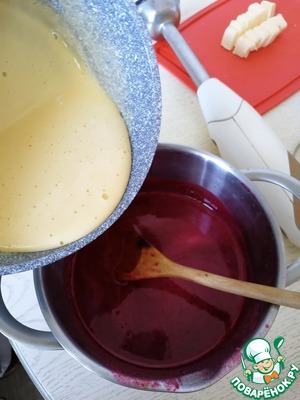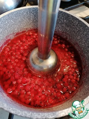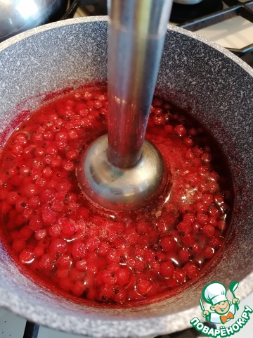 Теперь эту яичную смесь в пюре из красной смородины и варить на небольшом огне до загустения, не забывая помешивать.