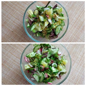 Салат из молодых летних овощей и зелени. В салат идёт ботва зелёная от редиса, хрустящие огурчики короткоплодные пупырчатые с грядки, сочный лук. Молодая разваристая картошечка делает салат сытным. Конечно же салат заправлю пикантной заправкой. Всё в нём польза!