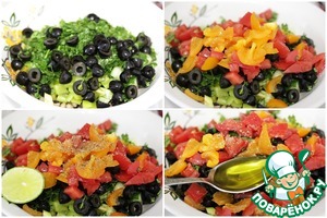 Добавить оливки, помидоры, соль и черный молотый перец по вкусу, влить оливковое масло и лаймовый сок.
