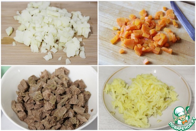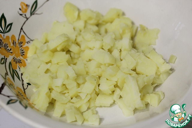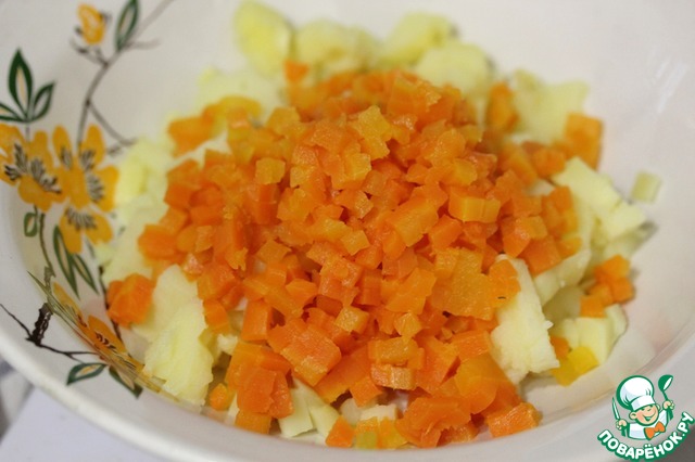 Картофель и морковь отварить, остудить, очистить и нарезать на мелкие кубики.
