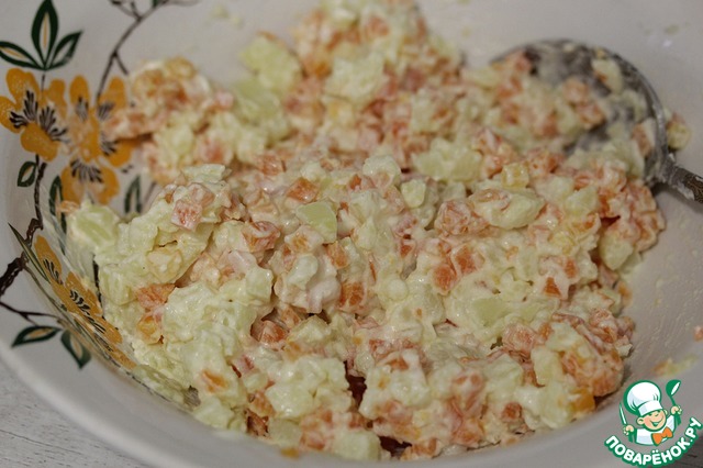 Посолить, заправить майонезом и перемешать.