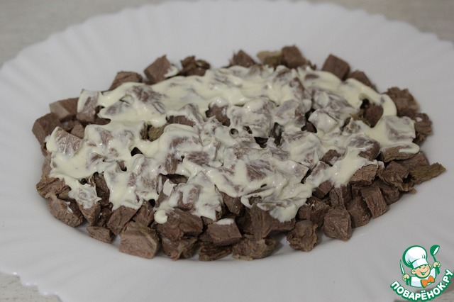 На блюдо или в салатницу выложить нарезанную говядину.