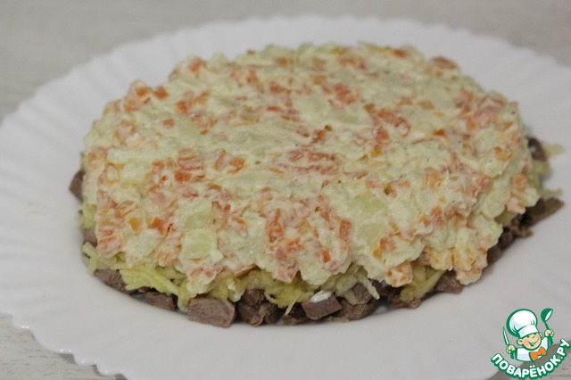 Добротный сытный салат – без изысков и претензий, но вкусный и вполне подходящий не только для будничной трапезы, но и для посиделок с друзьями.