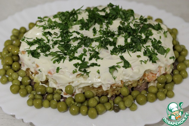 Перед подачей смазать салат небольшим количеством майонеза, украсить зеленью и горошком.