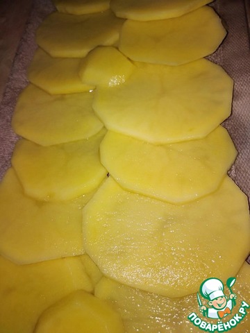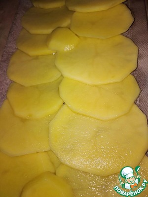 Картофелину среднего размера почистить, нарезать очень тонкими слайсами острым ножом (толщина не более 3 мм).