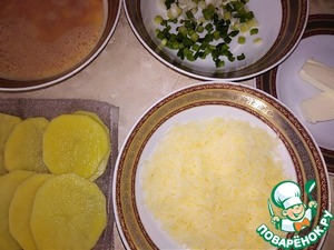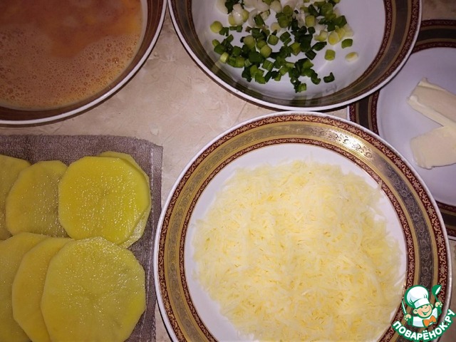 Составляющие для сытного завтрака готовы: яичная заливка: нарезанный тонкими слайсами, промытый в холодной воде и высушенный салфеткой картофель (не держать долго на воздухе); нарезанный мелко зеленый лук; натертый на средней терке твердый сыр; 2 столовые ложки сливочного масла.