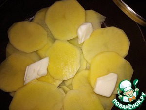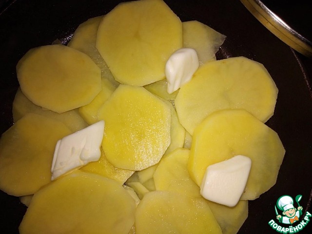 - Масло сливочное (твердое. Для смазывания сковороды под картофельными слайсами - 1 ст.л. Выложить кусочками на картофель - вторая ст.л.) — 2 ст. л.