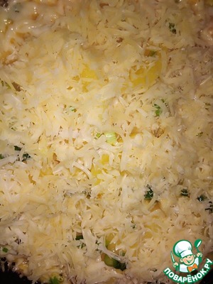 Открыть крышкой и распределить по поверхности тертый сыр. -