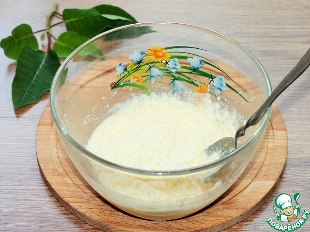 5. Творог пробейте блендером или перетрите через сито. Добавьте щепотку соли и манку, перемешайте.