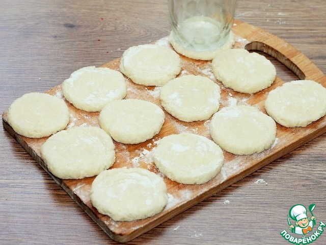 13. На припыленной мукой поверхности, разложите шарики и надавите рукой или стаканом. Должна получится круглая лепешка.