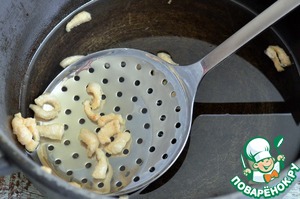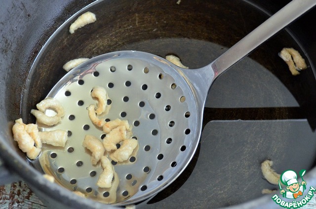 В 4 л. казане разогреть растительное масло, обжарить в нём кусочки курдючного сала. Затем шкварки выложить.