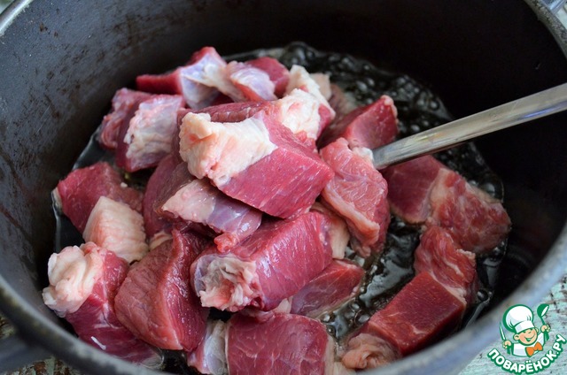 В кипящее масло выложить мясо, жарить до румяности, на сильном огне, минут 10.