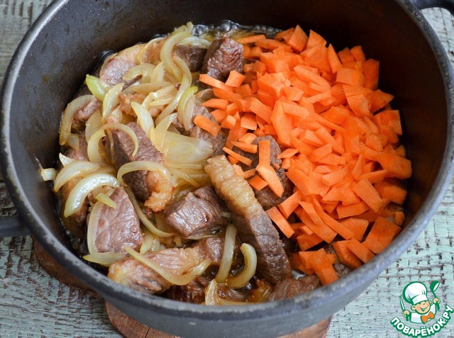К обжаренному мясу добавить лук, жарить до прозрачности, огонь средний, 5-7 минут. Затем добавить морковь.