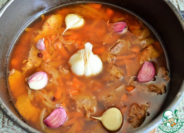 Влить 1,5 стакана кипятка, тушить 30-40 минут, разложить чеснок.
