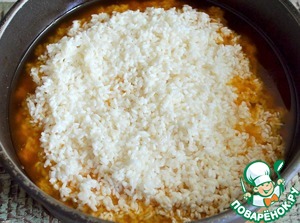Влить горячей воды, покрыв рис на 1 см.