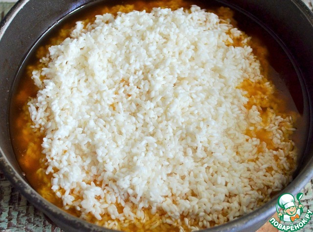 Рис промыть в нескольких водах, добавить в казан, слегка посолив.