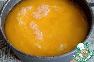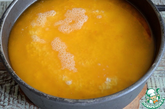 Обжарив морковь, добавить специи, посолить, причём чуть сильнее чем дОлжно быть.