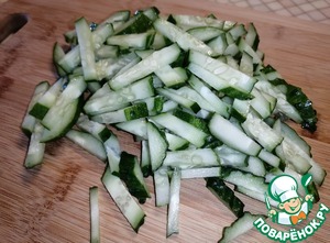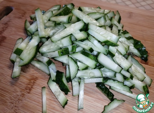 Огурцы нарезать длинными полосочками. Высыпать к крабовыми палочкам.