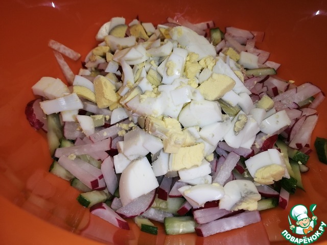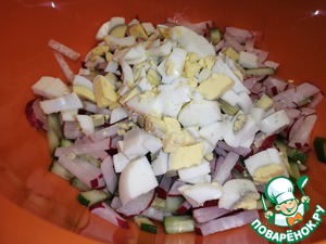 Крупно порезать варёные яйца.