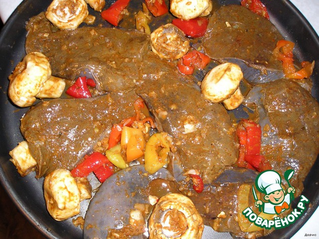 • Режем печень такими кусочками, как на отбивные. Натираем специями, отбиваем.