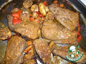 • В духовку разогретую до 230-250 градусов ставим противень с налитыми 2 стаканами кипяточка. А на решёточку выше - печень. Режим - гриль+конвекция. 15-20 минут. Очень нежно, очень вкусно! Как грибочки промариновались и запеклись, а печёночка!..