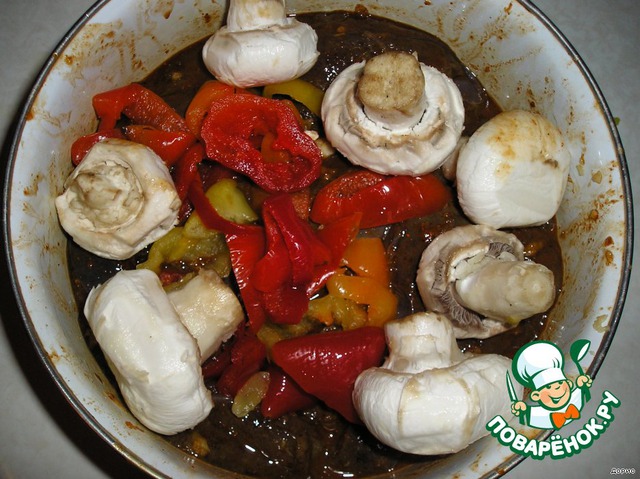• Добавляем выдавленный чеснок, соевый соус, лимонный сок. Чистим грибочки, перчик режем колечками (я достала из морозилки заготовленный заранее).