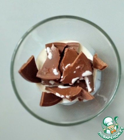 Далее шоколад поломать на кусочки, добавить сливки ( у меня 20 %). -