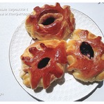 Только часть пирожков украсила. Тесто раскатать в пласт, нарезать ленточки, по краям сделать насечки, в центре небольшой разрез. Наложить на пирожок, края слегка подтянуть. Накрыть пленкой и оставить в теплом месте на расстойку на 20-25мин. За 5-7мин. до выпечки смазать пирожки желтком с молоком ( у нас оставался желток, в него добавить молоко). Выпекать в заранее разогретой духовки до 200С 20мин. до румяного состояния (следите за своей духовкой). Остужать на решетке.