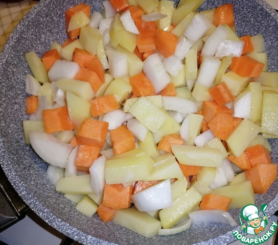 В разогретую глубокую сковороду налить растительное масло. Высыпать картофель, лук и морковь. Обжарить 15 минут.