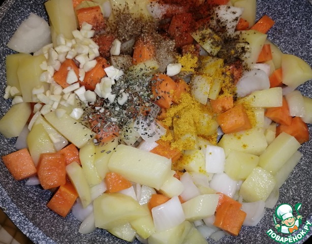 Добавить специи и порезанный чеснок. Обжарить 5 минут.