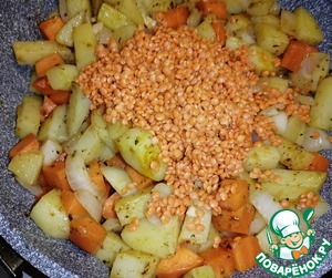 Чечевицу промыть и отправить в сковороду к остальным ингредиентам. Перемешать. Ещё обжарить 5 минут. Переложить в кастрюлю с бульоном и куриным филе. Варить 10 минут.