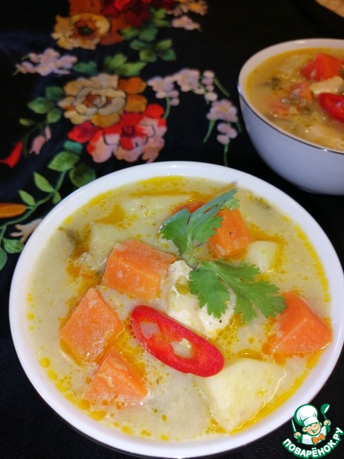 Влить сливки и добавить нарезанную крупно кинзу. Перемешать и варить на небольшом огне 5 минут. При подаче я украсила кинзой и кусочком красного острого перца.