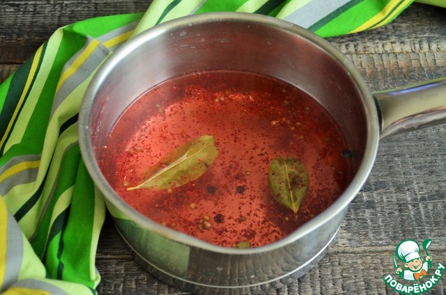 Приготовить маринад : вскипятить воду, добавить все специи, прокипятить 2-3 минуты, добавить соль/сахар, дать вскипеть и убрать с огня. Влить уксус.