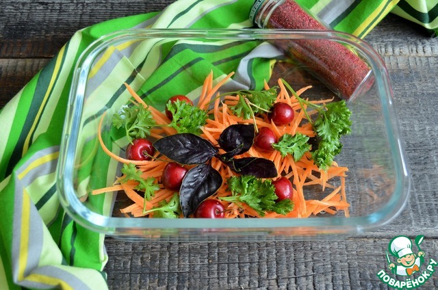 Вымыть и обсушить зелень, черешню. Сложить в стеклянную ёмкость, 2 л. объёмом. -