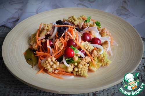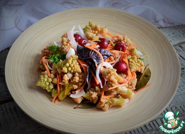 Закусок много не бывает, особенно из свежих летних овощей. Все витамины в гости к нам! А если Вам попадётся капуста сорта "Романеско", это ещё и очень красиво! Я люблю эксперименты на кухне, вот и сегодня - маринованные овощи с черешней... Угощайтесь.