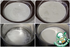 Смешать рисовую муку с крахмалом, добавить 0,5 стакана молока и хорошо перемешать, чтобы не было комочков.
