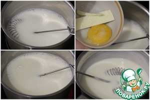 В горячее молоко добавить желтки, сливочное масло, соль и хорошо размешать венчиком.