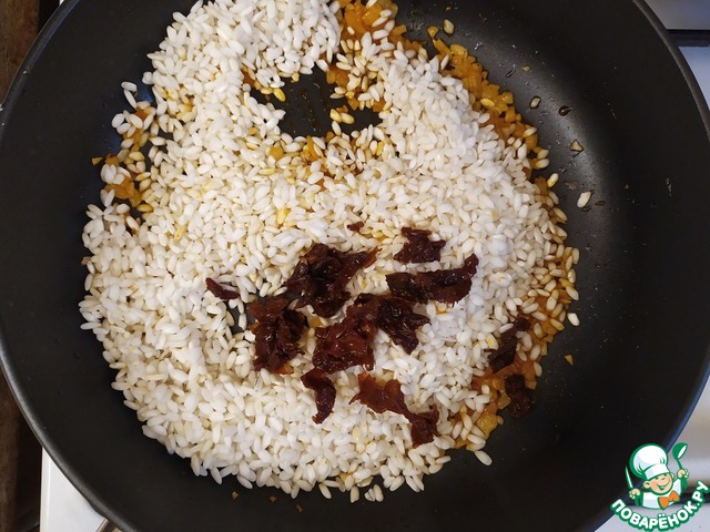 Добавим рис, нарезанные томаты, перемешаем и обжарим пять минут.