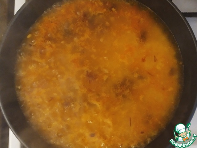 Добавим воду, посолим, перемешаем. Убавим огонь до среднего.