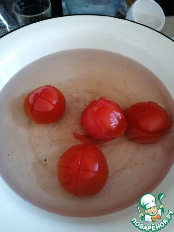 Помидоры очистить от кожуры: Подержать в кипятке, затем положить в холодную воду и кожура снимается очень хорошо.