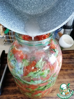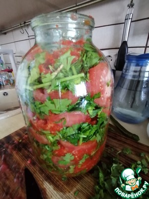 Теперь укладываем слоями в банку: Сначала зелень, потом несколько ложек овощной смеси, затем помидоры (их порезать пополам), опять зелень, овощи, помидоры и так до конца банки, закончить все зеленью и смесью из овощей.