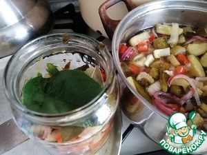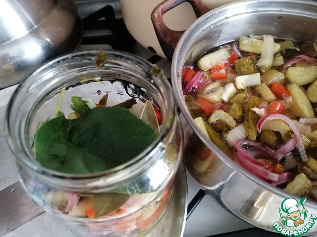 Вынуть овощи шумовкой разложить по банкам слоями и прокладывая слои смородиновыми и вишневыми листьями по 1 шт.