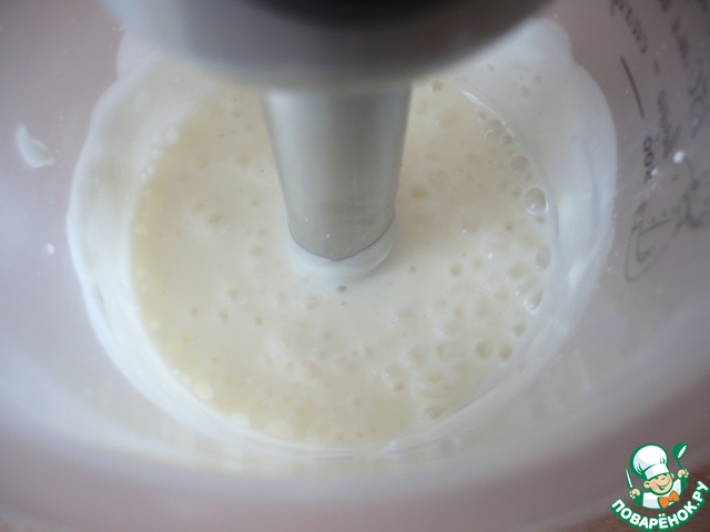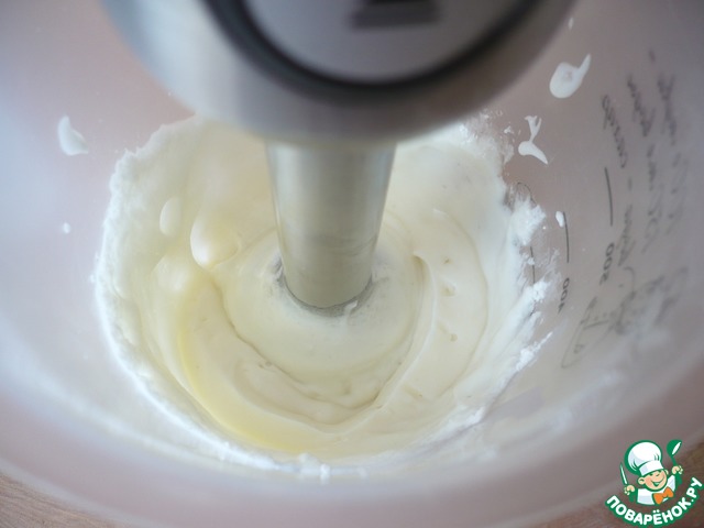 Взбейте холодные сливки с 3 ст. ложками сахарной пудры на высокой скорости.