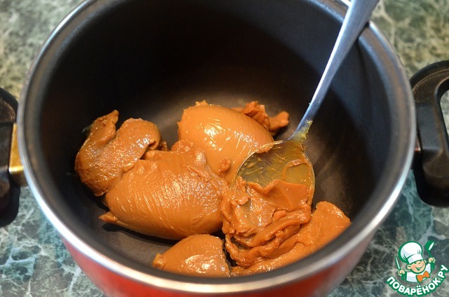 Возьмите сотейник с толстым дном, добавьте вареную сгущенку.