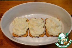 Выложите в форму рядом друг с другом печенье, сверху положите сливочную массу.