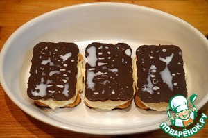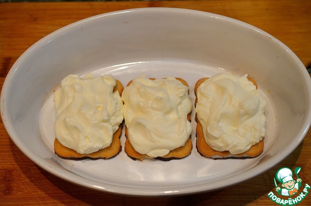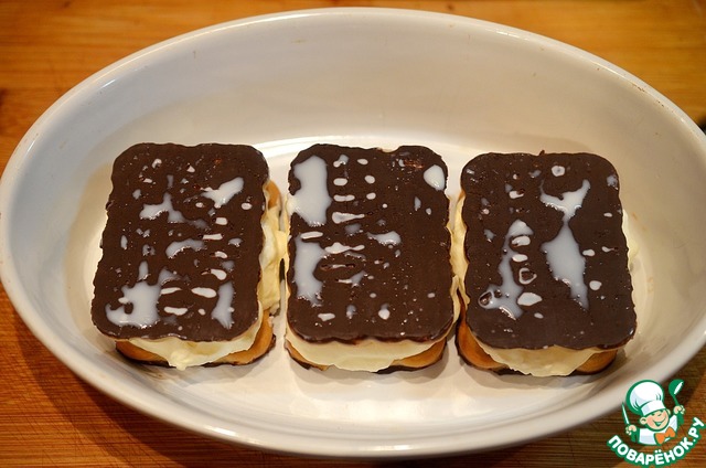 Накройте печеньем, смоченным в молоке. Отправьте в морозилку на 5-6 часов.