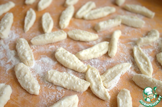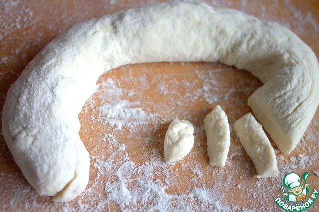 Из половины теста крутим колбаску, делим ножом на кусочки.