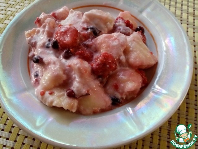 Ленивыми варениками я баловала семью часто, когда сидела в декрете: быстро, доступно, все едят, сытно на завтрак. Часть творога можно заменить на густой йогурт-будет нежнее. Вариант в ягодном соусе нашла на немецком канале и решила повторить, нам понравилось. Летом из свежих ягод готовим, зимой-из заморозки. По желанию предлагаем сметану, но мы так ели.