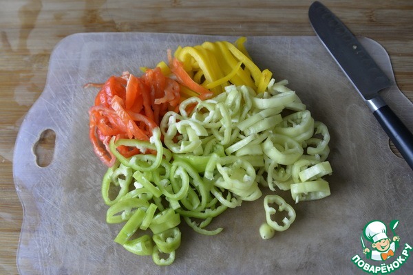 Перцы моем, чистим от семян. Режем полукольцами, кольцами или полосками в зависимости от размера.