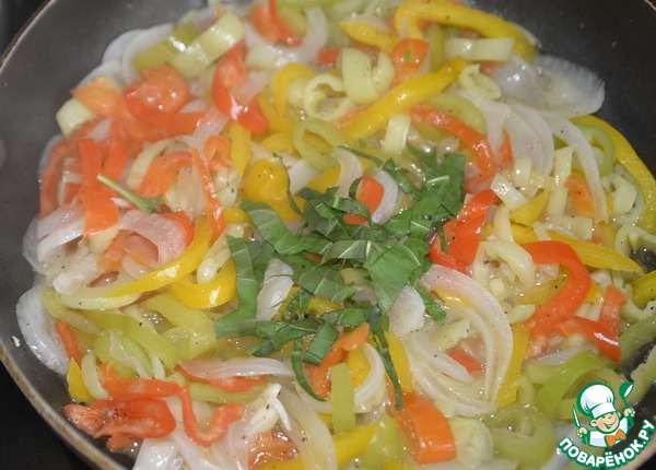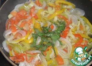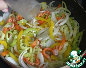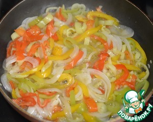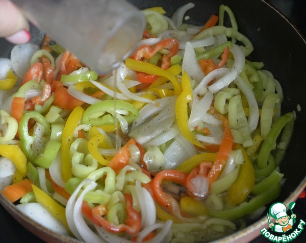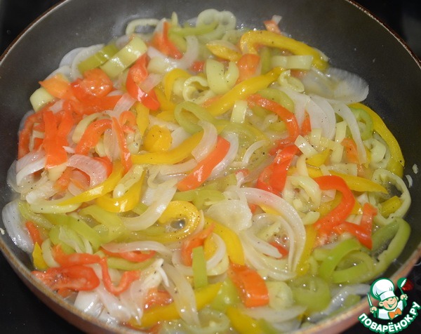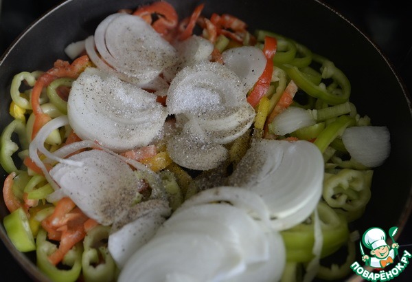 Обжариваем на среднем огне на масле лук и перец, около 5 минут, добавляем сахар, соль, молотый чёрный перец.